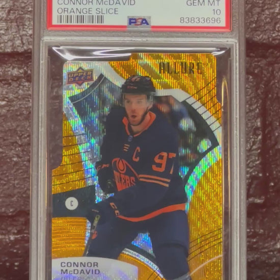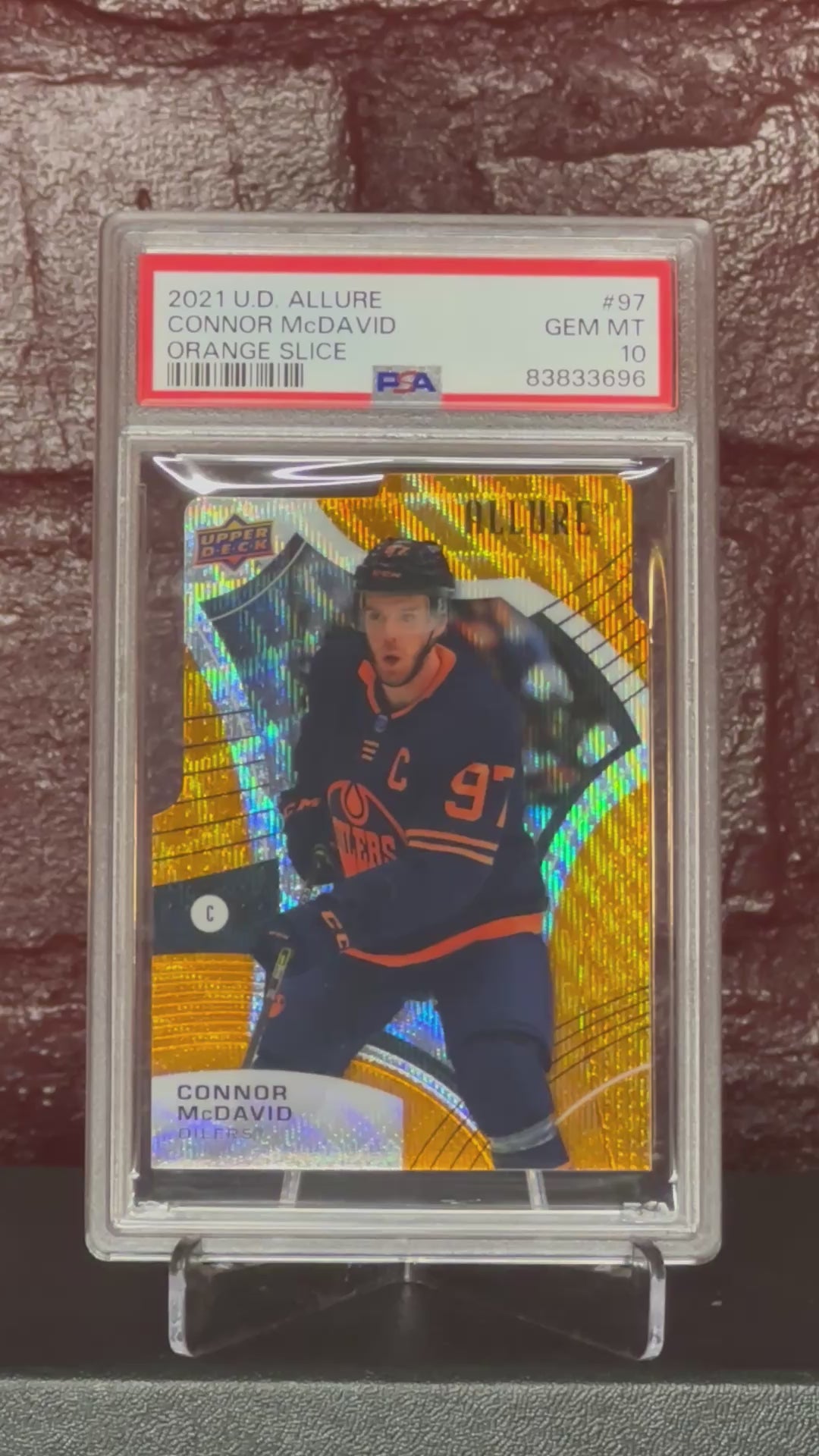 A stunning 2021 Upper Deck Allure Connor McDavid Orange Slice card, numbered #97, graded a flawless PSA 10 Gem Mint. This highly sought-after card features the Edmonton Oilers superstar and NHL icon Connor McDavid, showcasing vibrant orange accents from the exclusive Allure Orange Slice parallel set. The card’s pristine condition, as certified by PSA, ensures razor-sharp corners, perfect centering, and a flawless surface, making it a true collector’s gem. Ideal for hockey card enthusiasts, McDavid fans, or investors looking for a premium piece to add to their collection. Don’t miss your chance to own this elite, high-grade card of one of hockey’s greatest players!