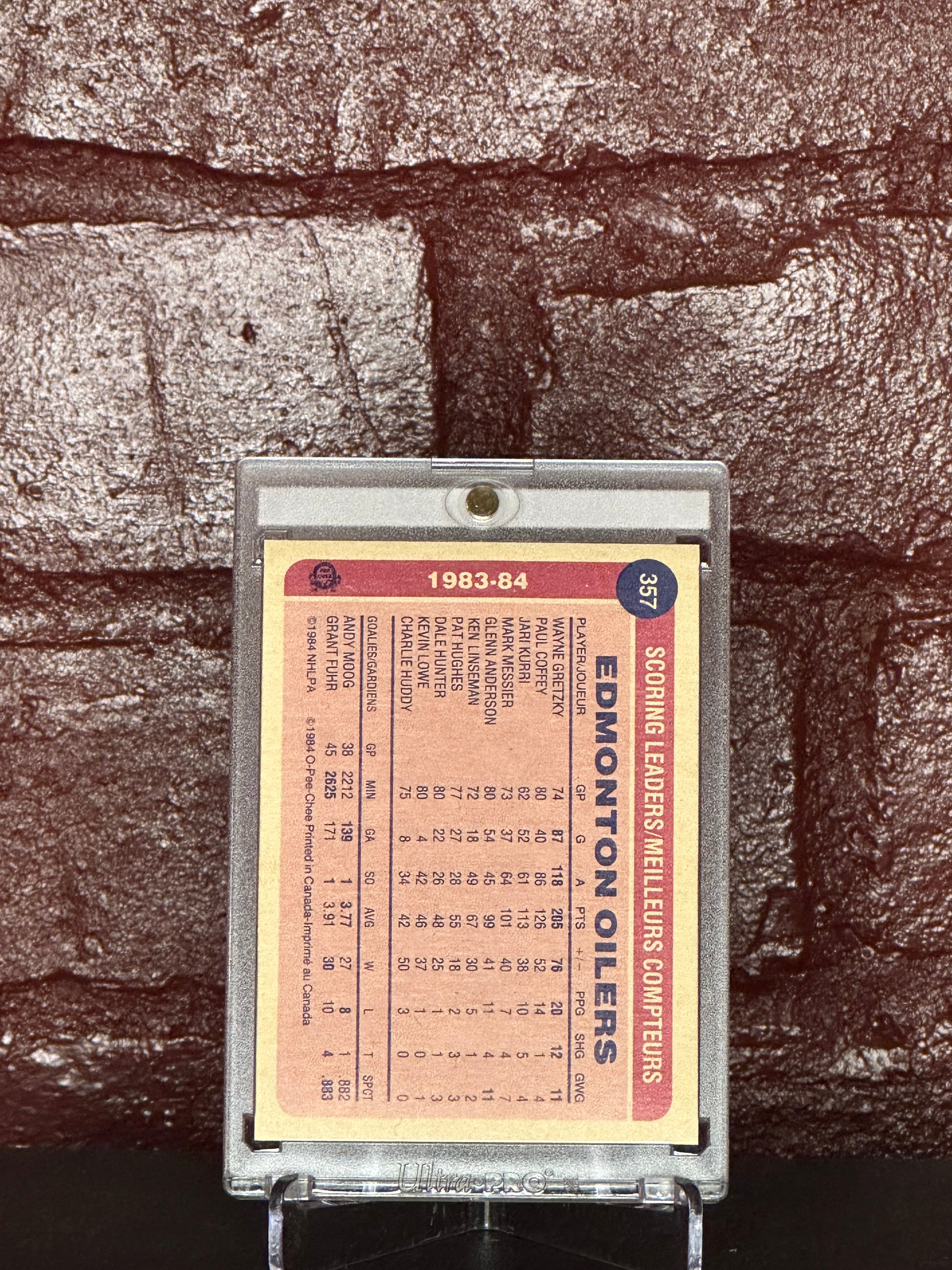 - Rarity & Parallels: From OPC’s Canadian run (smaller than Topps’ U.S. counterpart), #382 is a base leader card with no direct parallels, but its subset status and Gretzky premium add scarcity. High-grade examples are elusive—most survivors sit at 7-8 due to production quirks—making this a chase for set builders. Pairs with Gretzky’s ‘84-85 OPC base (#258) or All-Star (#208) for an Oilers-era rainbow.