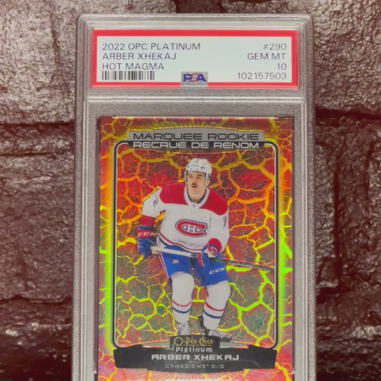 Add a standout piece to your collection with this 2022 OPC Platinum Arber Xhekaj Hot Magma parallel hockey card, numbered 348/499. Graded a perfect PSA 10 GEM MINT, this card features Montreal Canadiens’ fan-favorite defenseman, Arber Xhekaj, known as “The Sheriff” for his tough, commanding presence on the ice. The Hot Magma design pops with vibrant colors and crisp details, making this limited-edition card a must-have for NHL collectors. Don’t miss your chance to own this pristine, high-grade gem!